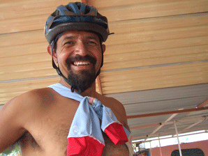 FAVIO BENALCAZAR; quiteño, 37 años de edad, el más pequeño del grupo comerciante, dedicado a la relojería, destacado ciclista y deportista de corazón, mimo y acróbata en telas, es quien ponía el ritmo en el camino desde Loja hasta Tulcán, recorrió 2.300km.